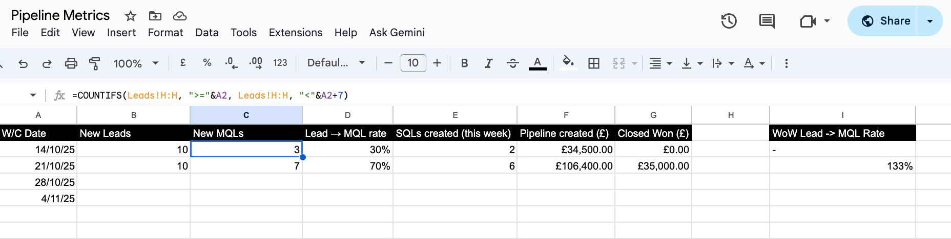 In your KPIs tab, calculate WoW Lead→MQL rate change using this formula: =([This week rate] - [Last week rate]) / [Last week rate]