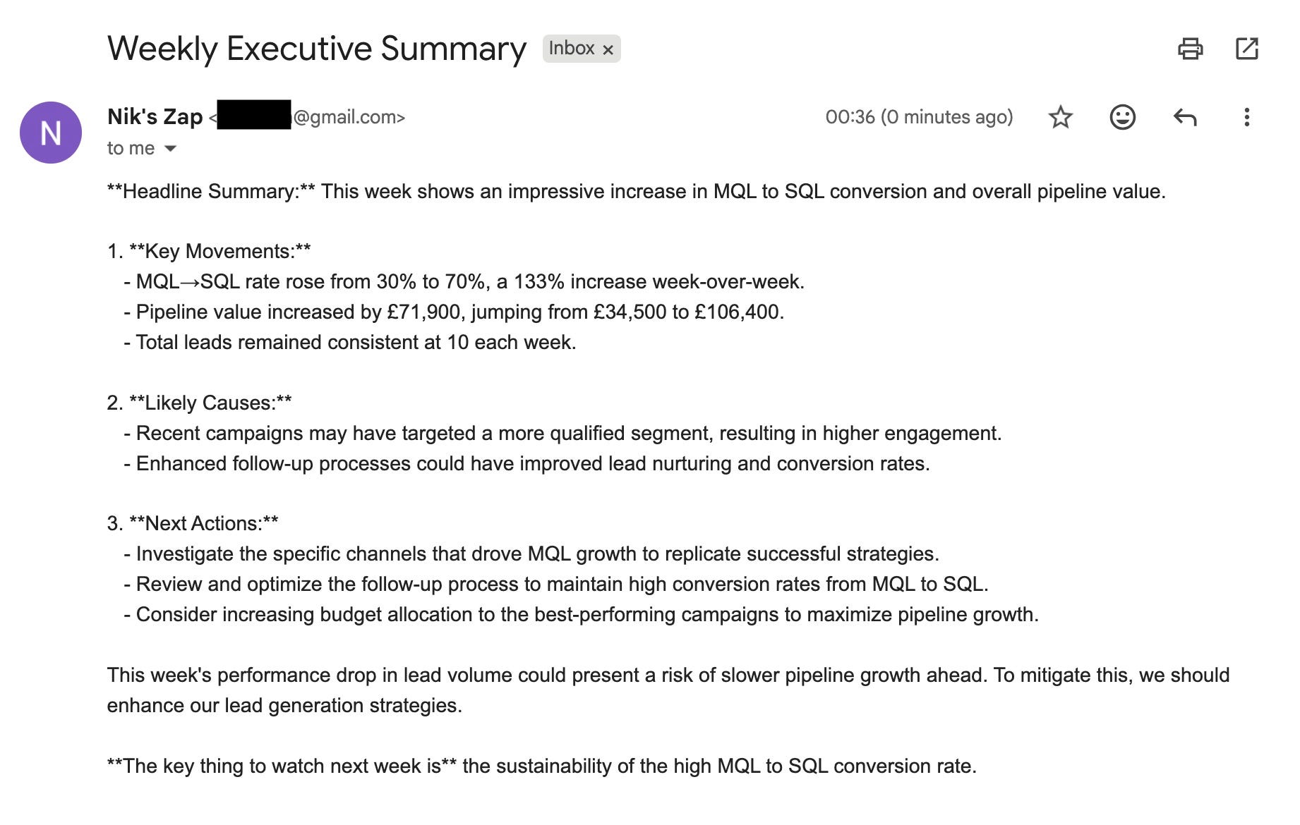 You are my marketing analyst. Review the KPIs tab in my Pipeline & MQL Master Sheet and summarise the latest week’s performance. Compare this week to the previous week. Focus on trends that matter for growth and pipeline health. Include: Headline summary: a short overview of overall performance (one sentence). Three key movements: e.g., Leads, MQL→SQL rate, Pipeline £, Win Rate. Include percentage or value change week-over-week. Two likely causes: offer clear, data-based hypotheses for what’s driving those changes (campaigns, channels, timing, etc). Three next actions: concrete recommendations — what we should fix, double down on, or investigate next week. If performance dropped, add one line on what risk it creates and how to mitigate it. Keep it under 200 words. Write it in a clear, executive-ready tone (like a Slack update I could post for my CMO and senior leadership). Avoid jargon. End with one short takeaway line: “The key thing to watch next week is…"